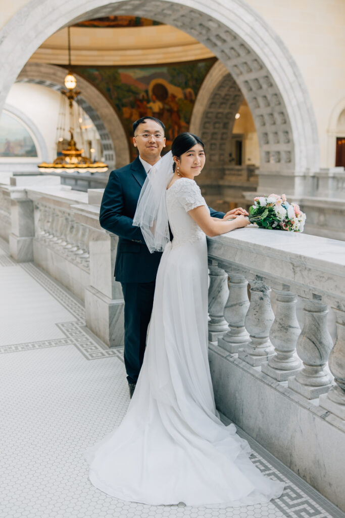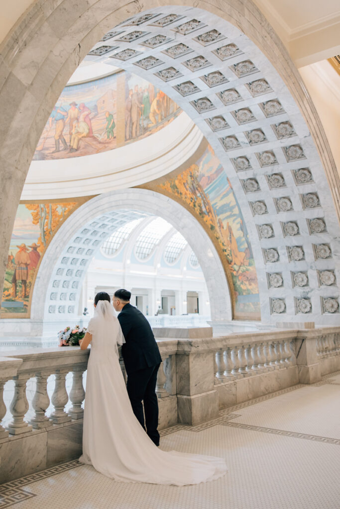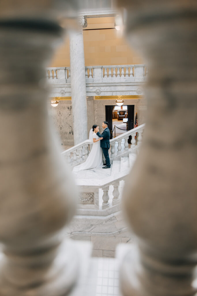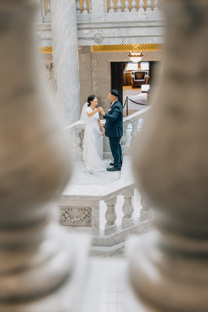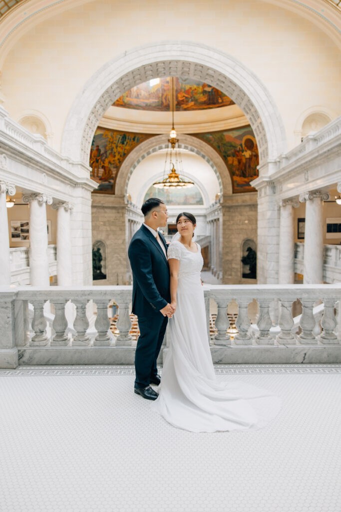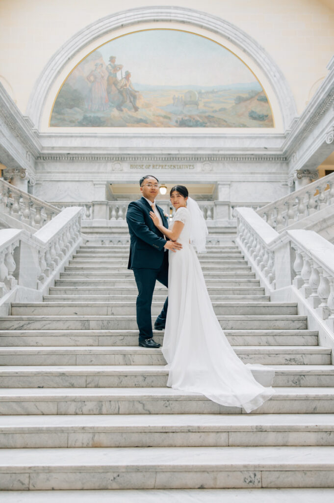 Theme and personal style: Think about your overall wedding theme and personal style. If your wedding has a specific theme or color scheme, you may want to choose a location that complements or enhances it. Indoors or outdoors, select a setting that aligns with your vision and personal aesthetic. The SLC Capital building is a very formal and elegant style on the inside or outside, so either would work here!