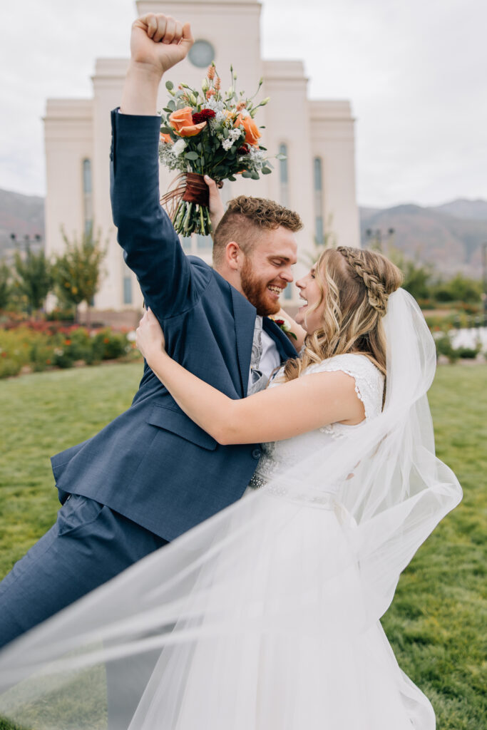 Temple exit followed by family photos, and 10-15 minutes of couples portraits around the temple